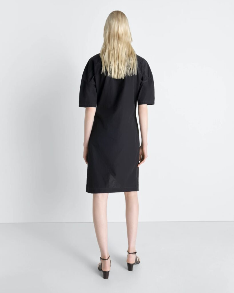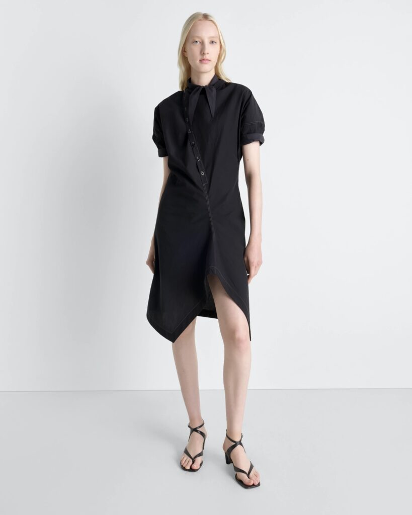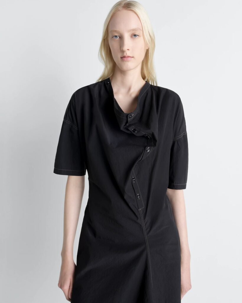 LEMAIREの動きへのこだわりからインスピレーションを得た、アシンメトリーなシャツドレス。首元はボタンで留めたり、開けたままでも着用できるカウルネックラインが特徴です。柔らかな手触りと少しシワ感のある、立体的なコットンクレープ生地を使用しています。