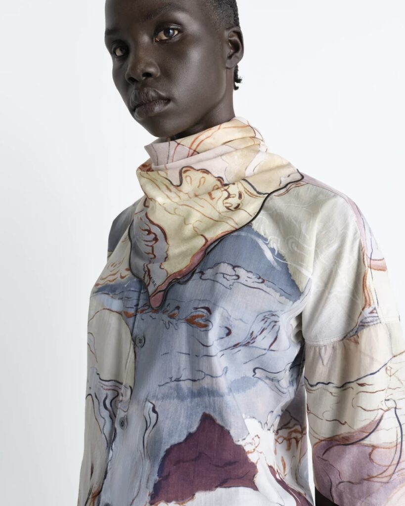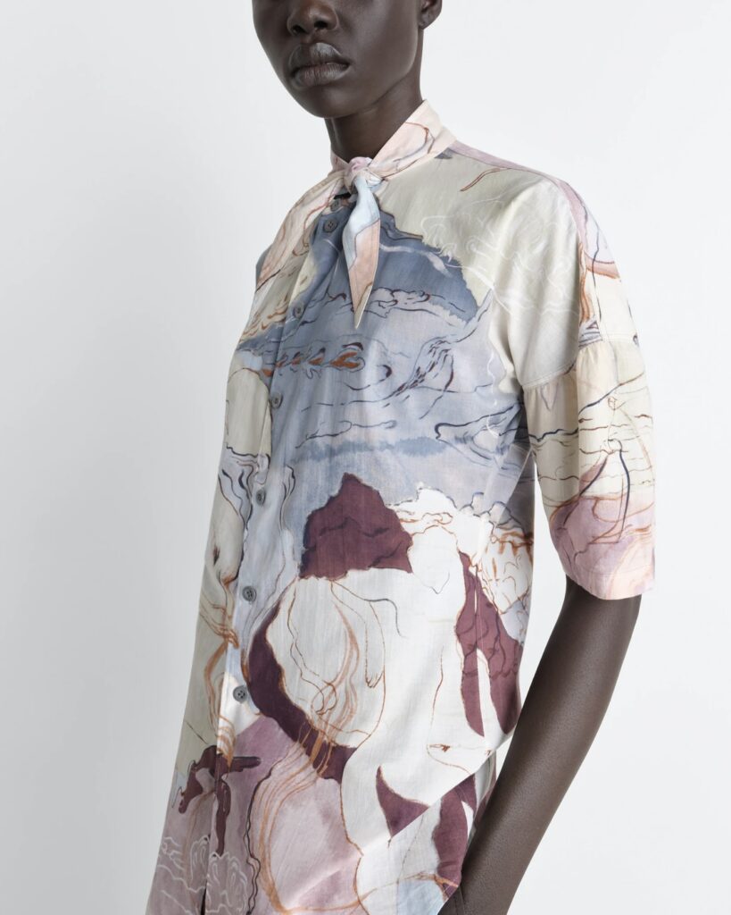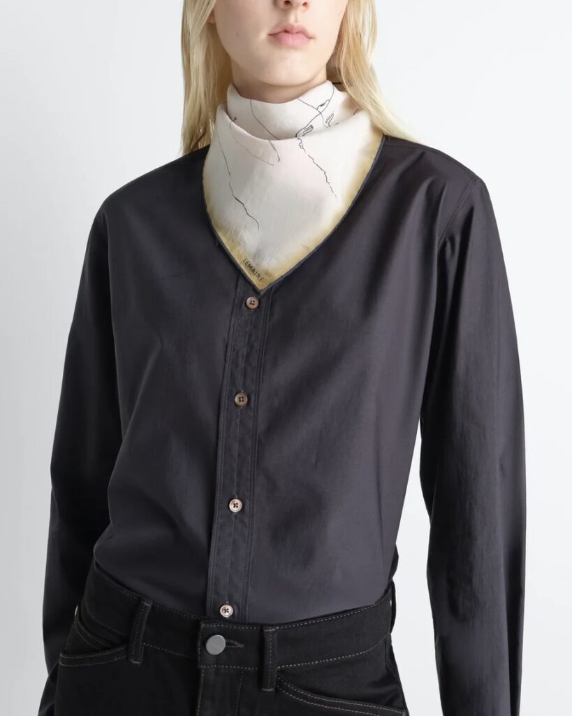 LEMAIREらしい快適さと洗練が調和するクラシックなシャツ。上品なプリントコットンで仕立てられています。一体型のスカーフは結んでも垂らしても、女性らしいアクセントを添えます。