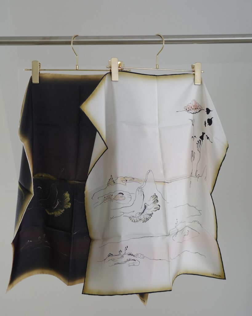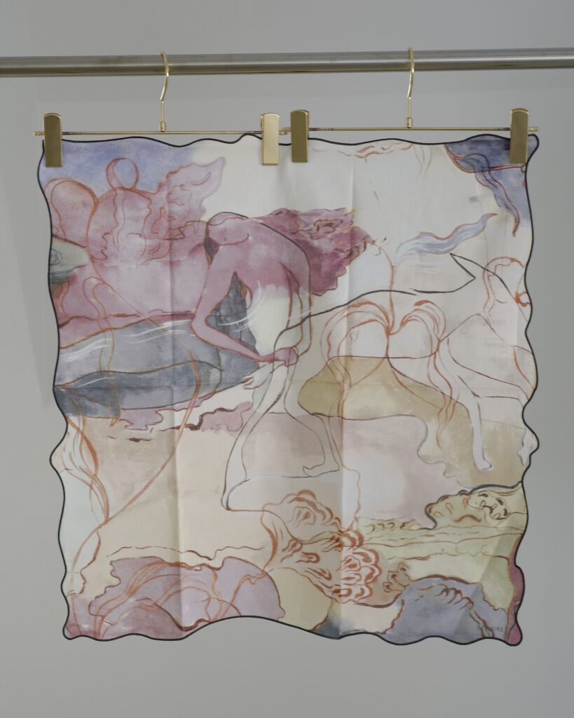 ハボタイシルクのスクエアに、夢のような風景がプリントされ、エレガントなシグネチャーとなっています。