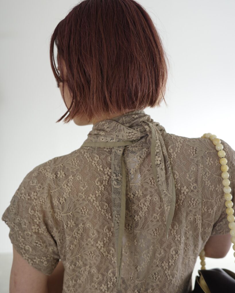 スカーフのようにも見えます。首の両サイドで結んだり、フロントで垂らしたりと、